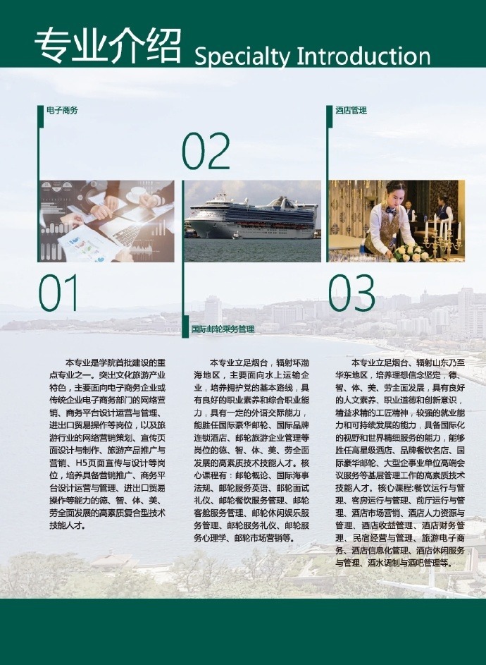 學(xué)院主動(dòng)對(duì)接煙臺(tái)市新舊動(dòng)能轉(zhuǎn)換“八大主導(dǎo)產(chǎn)業(yè)”發(fā)展需求,緊緊圍繞煙臺(tái)建設(shè)宜業(yè)宜居宜游城市和現(xiàn)代化國(guó)際濱海城市的戰(zhàn)略定位,致力打造“餐飲服務(wù)、智慧旅游、休閑康養(yǎng)、數(shù)字創(chuàng)意、現(xiàn)代商貿(mào)、智能制造”等專業(yè)集群。2020年學(xué)院首批開(kāi)設(shè)烹調(diào)工藝與營(yíng)養(yǎng)、廣播影視節(jié)目制作、酒店管理、空中乘務(wù)、電子商務(wù)、國(guó)際郵輪乘務(wù)管理6個(gè)高職專業(yè),擬招生1500人。同時(shí)學(xué)院還設(shè)置了單招和綜合評(píng)價(jià)招生計(jì)劃。